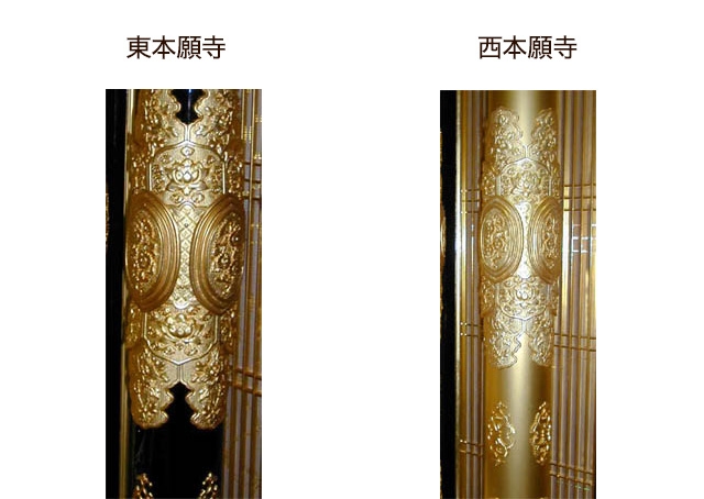 東本願寺は柱が黒塗りで金金具打ち、西本願寺は柱が金色で金金具打ちです。